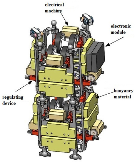 This is an ROV 3D model that has an electrical machine, regulating device, electronic module, and buoyancy material.
