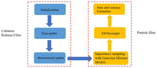 The EM algorithm [28] is used on the basis of MOGCPF to calculate MOG parameters in the set of importance-sampled particles, which reduces to G, improves the problem of particle sample degradation, and reduces the computational effort. The algorithm flow is shown in Figure 4.