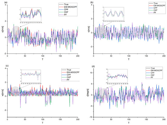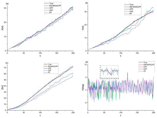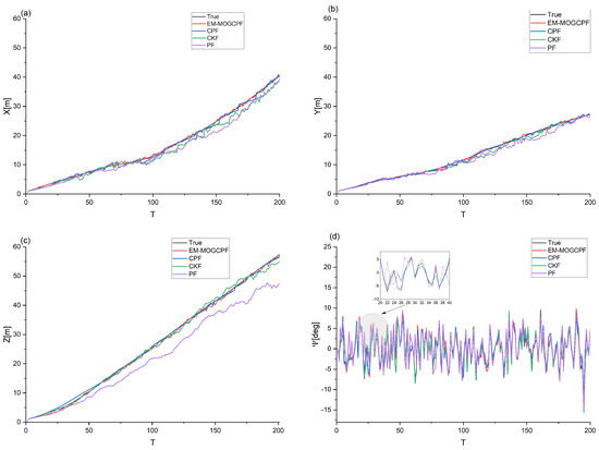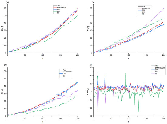 There is a light breeze and smooth wavelet on the sea surface at a sea state of 1–2, and the measurement noise is non-Gaussian distributed, . Figure 7 and Figure 8 demonstrate that the CKF algorithm diverges in both the XYZ axis and yaw angle estimation when the noise distribution is non-Gaussian. This indicates that CKF is only suitable for Gaussian noise environments. Furthermore, in the estimation of Y and Z axis displacement, particle degradation gradually occurs in PF after a certain period of time. The importance density function of CPF cannot always be approximated by a Gaussian distribution, as evidenced by the small divergence observed at sea state levels 1–2. Hence, the proposed algorithm shows improved noise immunity by incorporating a mixed Gaussian model. Overall, the results suggest that the algorithm presented in this paper outperforms CKF, PF, and CPF under mixed noise conditions.