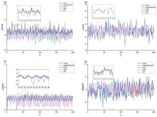 The Kalman filter is designed on the ROV of the 4-DOF dynamic model, and the dynamic model of the ROV has been given in Section 2.3. The state variables are defined as follows:
