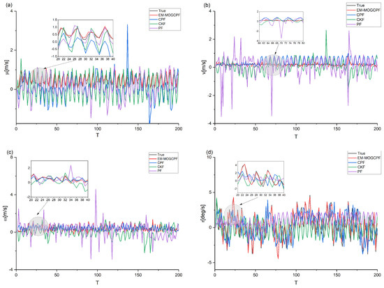 XYZ-axis and yaw angular velocity error at sea state of 1–2. (a) X-axis velocity estimation error; (b) Y-axis velocity estimation error; (c) Z-axis velocity estimation error; (d) Yaw angular velocity estimation error.