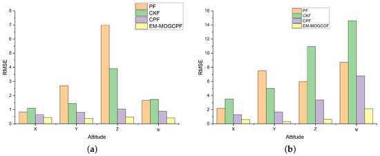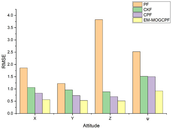 - As the sea state degree rises to 3, the RMSE of CKF in three attitudes is greater than that of particle filtering; it shows that as the noise environment becomes more complex, the accuracy of CKF estimation is worsened. Similarly, the performance of CPF at this sea degree is also poor. By comparison, the estimation accuracy of EM-MOGCPF is also the highest among the four algorithms. RMSE does not show large values as the sea degree increases, and it has good noise immunity in complex environments. Compared to CPF, which has the best relative stability, the accuracy is improved by . This shows that EM-MOGCPF has good estimation accuracy even at the maximum operating conditions.