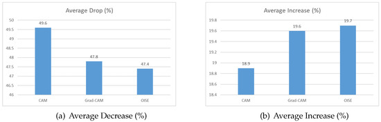 As shown in Table 3, OISE has an average decrease rate of 47.4% and an average increase rate of 19.7%, which is better than other CAM-based methods. The original input is masked by point-wise multiplication with the saliency maps to observe the score change on the target class. We follow the metrics used in [25] to measure the quality, the average drop is expressed as and the average increase is expressed as , where is the predicted score for class c on image im and is the predicted score for class c with the explanation map region as input. The experiment is performed on the ILSVRC2012 validation set; 2000 images are randomly selected.
