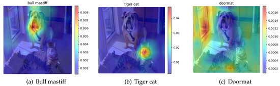Compared to previous methods, this work significantly narrows the significant range of recognition results, allowing for more accurate localization. For example, when identifying an image as a bull mastiff, both the face and the body are responsible for the recognition result, but the facial features are more indicative of the animal being a bull mastiff than the body. It also solves the drawback that the previous method could not or did not perform the classification task better. Figure 6 shows the results and the reasons for OISE to recognize different target objects in the same image. This shows that OISE can classify multiple targets. The color change of the saliency map indicates the different importance of each pixel, with the red color indicating the most important part.