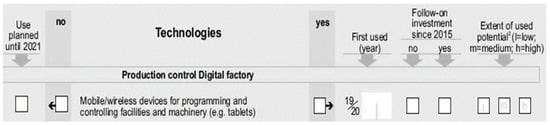 For the purpose of our research, 7 technologies from the “production control: digital factory” group were analyzed, and both types of industrial robots from the “automation and robotics” group. In the separate technology questions, the use of additional industrial robot types was investigated, such as mobile industrial robots, collaborating robots and autonomous industrial robots.