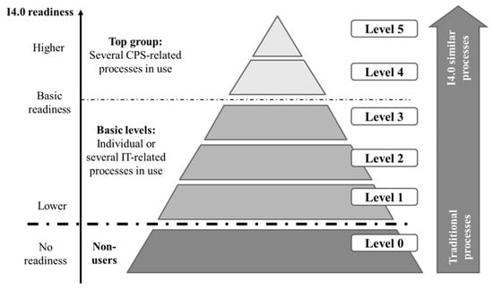 With each level, the Industry 4.0 readiness status increases, or the distance to digital production decreases. However, even at levels 4 and 5, it cannot be assumed that these are firms that embrace the Industry 4.0 concept fully. Nevertheless, the presented Industry 4.0 readiness index maps the change from traditional production to production close to Industry 4.0 [].