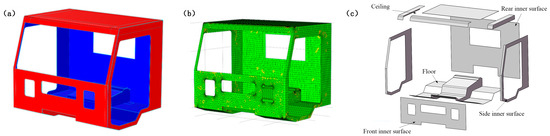 The simplified cab body: (a) structural model diagram; (b) grid quality map; (c) exploded view of the finite element model.
