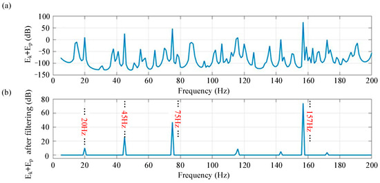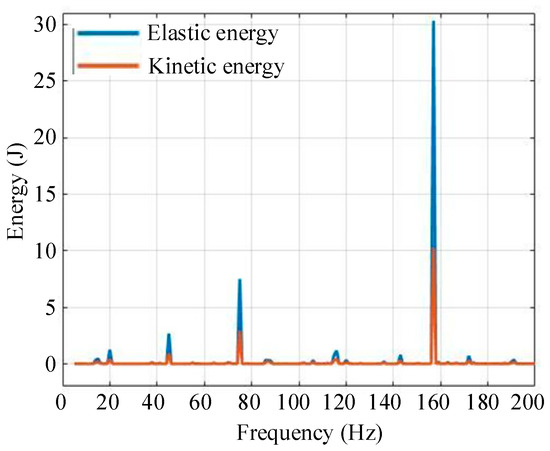 From Figure 4, in the 0–200 Hz frequency band, after applying a specific excitation, the various order modes of the body structure can be excited to a certain extent, among which the modal frequency positions correspond to 20 Hz, 45 Hz, 75 Hz and 157 Hz. Resonance energy is generated, and its mode shape is shown in Figure 4, which is close to the previous modal shape analysis results. Simultaneously, combined with Equation (11), the modal energy results are sorted and processed, and the energy proportions of multiorder modes are obtained as shown in Table 1.
