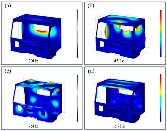 On the data in the above table, the sum of the modal energy ratios at the frequency positions of 157 Hz, 75 Hz, 45 Hz and 20 Hz reaches 91.4691%, which meets the control criteria for selecting the objective function and criteria based on the quantity. Vibration pickup and actuation are realized based on the four frequency positions, and the noise and vibration of the body structure can be efficiently controlled. As shown in Figure 5, considering the modal shapes of each order, there are six peak areas and three peak areas at the ceiling and rear surrounds at 45 Hz and 75 Hz, respectively, and the distribution is similar to the modal shapes at 157 Hz and 20 Hz. Therefore, nine actuators/sensors are selected to achieve active acoustic and vibration suppression of the body structure by controlling the above-mentioned four vibration modes.