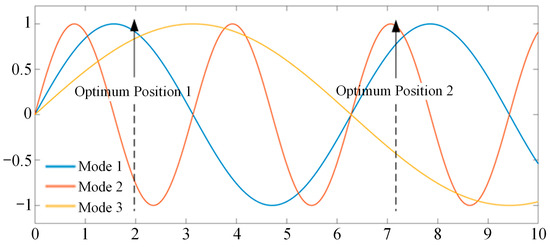 The engineering significance of the controllability/observability criterion for multimodal composite control can be understood as: in a certain frequency band, apply equal-amplitude excitation to the structure or system at a fixed position to obtain the sensor position that can detect the maximum vibration response; or make the actuator apply a constant value excitation force, change the actuator position, and obtain the actuator position combination that shows the peak vibration response of the structure or system. Its core point lies in the compound vector control of multimodal mode shapes. The schematic diagram for easy understanding is shown in Figure 6.