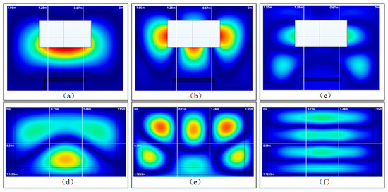 Plane division of location selection points: rear inner surface corresponds to (a) f = 20 Hz, (b) 45 Hz and (c) 75 Hz; ceiling corresponds to (d) 45 Hz, (e) 75 Hz and (f) 157 Hz.