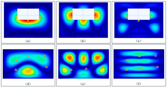 Figure 9 shows the final actuator/sensor coordinates and corresponding modal shapes, where Figure 9a–c represent the division of the rear inner surface at 20 Hz, 45 Hz and 75 Hz, while Figure 9d–f represent the division of the ceiling at 45 Hz, 75 Hz and 157 Hz, respectively. The diagram illustrates the coincidence of the coordinate points of the device and the vibration modes of each order, in which the position of the yellow aperture is the position of the active control device, and its spatial geometric coordinate combination is shown in Table 2. The analysis shows that the position of the device is close to the peak points of the main mode shapes of the body roof and rear, and there is a strong correlation between the combination distribution and the four mode shapes. The rationality of the selection of active control devices for multiorder modal compound control is verified from the point of view of geometry.