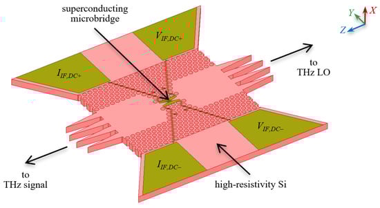 Figure 1 provides a three-dimensional (3D) model of a nearly all-dielectric HEB mixer designed for operation at 2.7 THz. Openings in Si are used to define geometries of MMIPC and PCWG. Four-wire biasing of the HEB element is implemented.