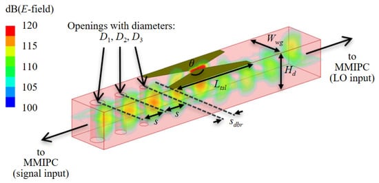 To improve efficiency of an end-fire coupling, front and rear waveguide ends of the developed transition are terminated by Si forked antennas. Each antenna is presented by a four-element DRA array integrated with 4 × 1 ports MMIPC, as depicted in Figure 3.
