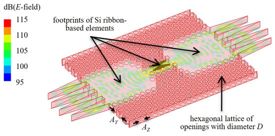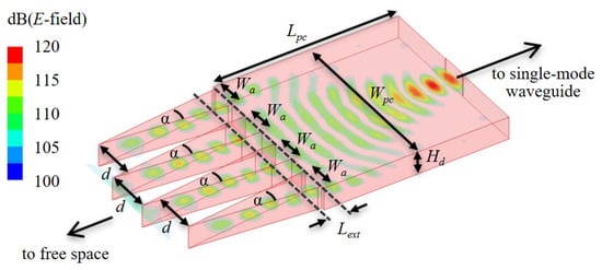 Superposition of the harvested modes results in four equally spaced power maxima at the MMIPC input. Almost 90 phase delays appear in the lateral ports of the combiner with respect to the central ones. To implement a uniform linear array with a zero-phase increment between antennas, we extend two central DRAs by Si ribbon inserts. Details on the geometry developed for the 2.7 THz operation are summarized in Table 2. This geometry ensures simulated gain of 12 dB with a corresponding side lobe level of −13.1 dB and decent matching to a single-mode Si waveguide. The half-power beamwidth equals in the DRA array plane. In the EM simulations, as before, dielectric losses in Si are neglected, and its relative permittivity is set to 11.9. When calculating the radiation pattern of the DRA array integrated with MMIPC, we rely on the principle of reversibility and simulate its performance in a transmitting mode. The MMIPC side walls and the DRA array are surrounded by quarter-wave vacuum insets terminated by radiation boundaries. The MMIPC single output is excited by a wave port. The port has linear dimensions of (width × height), mode polarity is set using integration lines, and no post processing is performed.