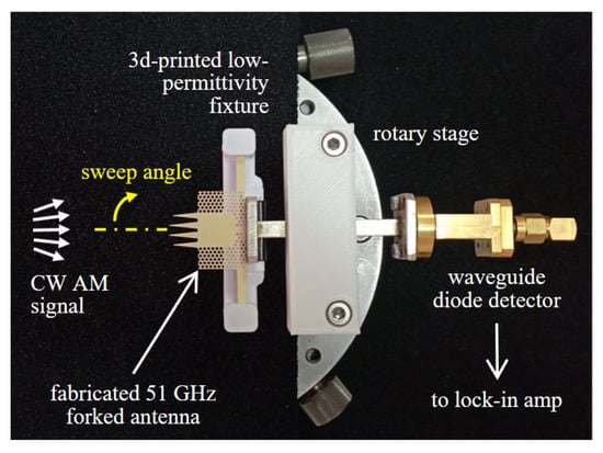 Referring to Figure 5, the experimental setup for beam profile measurements comprises a microwave frequency synthesizer, rotary stage, waveguide diode detector, and a lock-in amplifier. The synthesizer provides a 51 GHz continuous waveform (CW), with amplitude modulation (AM) at 1 kHz, widespread into a free space. The antenna prototype is coupled with a WR-15 input of the detector. The latter, in turn, is mounted on the rotary stage placed far behind a Frauhoffer distance in front of the synthesizer. The response voltage from the detector is fed into a lock-in amplifier. We use a microwave absorber to filter out spurious ambient radiation. For peak incident power levels of 0.28 μW, the detector response voltage equals 550 μV. Given that the detector noise voltage of 0.04 μV is measured, we can conclude that the detector is operated within its specified dynamic range of 44–45 dB during the measurements.