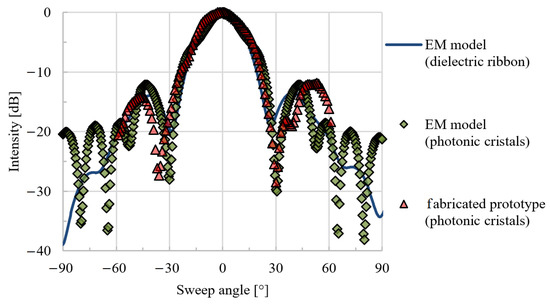 As one can see in Figure 6, far-field beam of the fabricated 51 GHz forked antenna has a 27 wide main lobe with high Gaussisity in the antenna plane. The observed side lobe level does not exceed −12 dB, which outperforms similar low-permittivity designs earlier reported in the literature []. Experimental data are in good agreement with the results of EM simulations. The latter, in turn, predict the antenna gain of 11.2 dB with a side lobe level of −12.1 dB and a half-power beamwidth of 21 for the geometry developed. Such a behavior is also consistent with the forecasts of the 2.7 THz EM models for the Si platform. A further increase in the beam directivity is possible upon combining the developed dielectric forked antennas in linear or planar arrays.