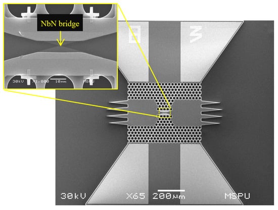 A scanning electron microscope (SEM) image of the fabricated HEB mixer is provided in Figure 7. The mixer is based on a 4 nm thick NbN film, which has a critical temperature of 8.7 K with a transition width of 0.7 K and critical current density of 2.5 MA/cm2. Sheet resistance of the film equals 830 at room temperature. The sensitive element of the mixer is presented by an NbN bridge with nominal linear dimensions of 0.2 μm × 2.0 μm (length × width). We observe a mean value of room temperature resistance of 73 for the mixers produced. This suggests that the bridge area slightly deviates due to imperfections in e-beam-assisted patterning of NbN film and Ti/Au contacts.