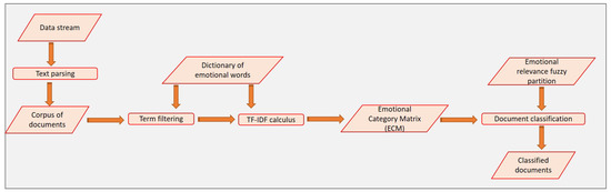 NLP methods are generally applied to carry out the morphological, syntactic, and semantic analysis of the text, in order to extract information necessary to detect emotional states. Recently, to ensure the accurate text analysis of documents, highly performing NLP neural network models have been proposed [5,6] and some authors apply deep learning methods for sentiment classification and sentiment extraction in data streams [7,8]. However, in some cases neural and deep learning models are unsuitable due to the difficulty of obtaining training data; this happens especially in streaming environments where the data flow varies continuously [9], making it impractical to label and extract data samples and causing the presence of unbalanced classified data over time.