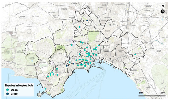 All 50 theaters have been georeferenced as point features on the map. Subsequently, for each theater the reviews and opinions of users posted on a set of Italian websites dedicated to reviews of service facilities were acquired; in particular, reviews written on the websites TripAdvisor (https://www.tripadvisor.it/ accessed on 1 April 2023) and Google Maps (https://www.google.it/maps/ accessed on 1 April 2023) were acquired, considering the reviews inserted in the last five years. Four theaters (Tasso, Spazio Libero, Auditorium di Scampia, and Villa Patrizi) were closed during this period. They were georeferenced but were not evaluated.