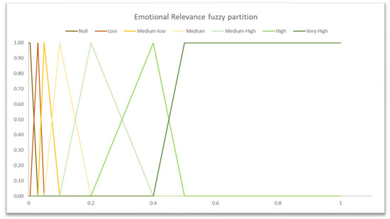 To create the emotional relevance fuzzy partition, we used a fuzzy partition composed of n = 7 fuzzy sets labelled as: null, low, medium–low, medium, medium–high, and very-high. The fuzzy set null is an R-function, the fuzzy set very-high is an L-function, and the other fuzzy sets are triangular fuzzy numbers. Figure 4 shows these seven fuzzy sets.