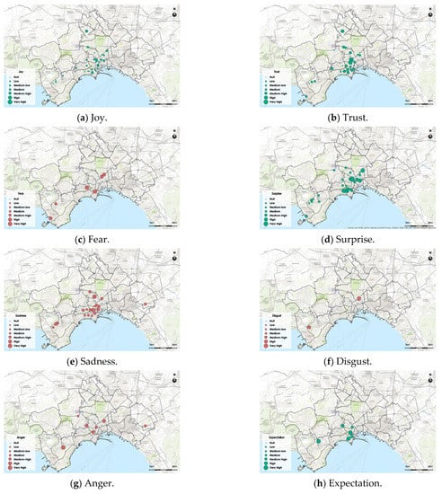 In Figure 5, the eight thematic maps of the relevance of the primary emotional categories are shown.