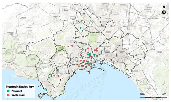 The unpleasant emotional category is prevalent with a frequency of 25 theaters out of 46, which is 54% of the total, while the pleasant ones are the remaining 46%. The districts in the city center are the ones that most frequently belong to the emotional category pleasant while the western area turns out to have the largest number of theatres that belong to the emotionally unpleasant category.