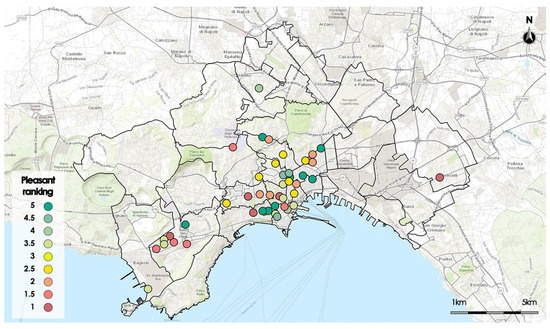We created a thematic map of the relevance of pleasant emotional categories, partitioning the closed interval [0, 1] into nine thematic classes of equal breadth in order to compare our findings with the synthetic assessments by using approval scale produced by the review-collecting providers. We call this map the pleasant ranking map. This partitioning into nine classes is due to the fact that the rating assigned to the element by the providers is a value between 1 to 5 with a minimum sensitivity of 0.5. Each user, when entering the review, assigns a rating given by an integer from 1 to 5; the element is assigned an overall score equal to the average value of the scores assigned by all users with a minimum sensitivity of 0.5.