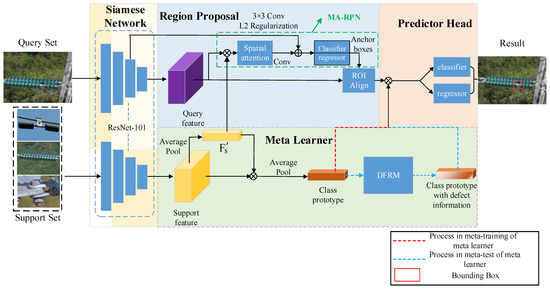 Figure 2, which mainly consists of four parts: feature extraction network, region proposal module, meta-learner, and predictor head. The feature extraction network is responsible for extracting features from the support set and the query set. The region proposal module, with MA-RPN (Meta-Attention Region Proposal Network) as its core, generates proposal regions of query images with fusing support set features, which could reduce noise in proposal regions. The meta-learner is used to learn the meta-features of each class in the support set as prior information to assist the model in detecting the target in the query set. In addition, a defect feature reconstruction module is designed to enhance the feature representation of defects in meta-features. The predictor head is responsible for classifying and regressing the proposal region features of the query set to generate the final detection results. In addition, the normal components with sufficient samples are selected as base classes, while the defect components with few samples are treated as novel classes.