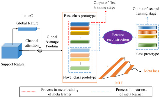 As the most important module in the meta-learning-based object detection model, the meta-learner generates class prototypes as meta-features for each target class by extracting sufficient support set features to assist the model in classifying ROI features of query set. However, the overall features of the defective components of the power transmission line are similar to those of the normal components. The overall features of normal components have already been learned in meta-training. However, treating novel classes as completely new classes unrelated to base class in meta-test not only results in learning insufficiently the features of defective parts but also adds unnecessary redundancy to the predictor head.