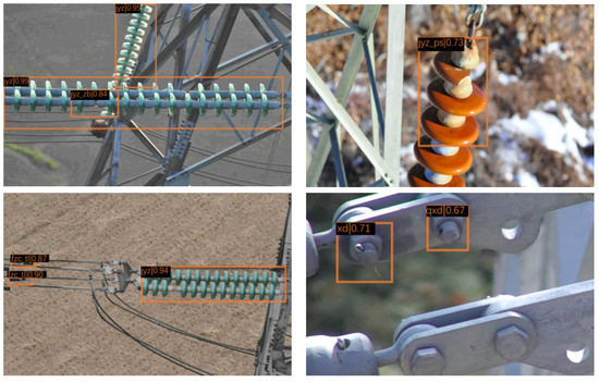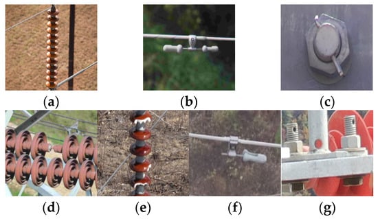 We validate the model’s detection effect using both a self-built few-shot defect dataset on power transmission lines and a public dataset. The self-built dataset includes 3845 images of three important components in power transmission lines, namely, an insulator, vibration damper, and pin, as well as 571 corresponding images of defective components covering four types of defects, including insulator self-explosion, insulator damage, damper missing, and pin missing. The training set, validation set, and test set are divided in a ratio of 7:2:1. In addition, according to the few-shot object detection dataset standard, we selected 30 objects with more obvious features for each class in the above training dataset to construct a few-shot dataset. Specifically, seven few-shot annotation files corresponding to each class are provided to generate support set data for the meta-learner. Since we plan to experiment with 30 shots of each class, every few-shot annotation file contains several image names, which include 30 annotations of the corresponding class. As multiple objects may be selected in one image, the few-shot training dataset consists of 141 images. An example of the power transmission line dataset is shown in