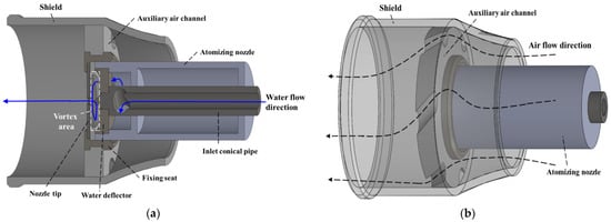 Air and water flows in and out of the atomizer. (a) Water flow direction of atomizer. (b) Air flow direction of atomizer.