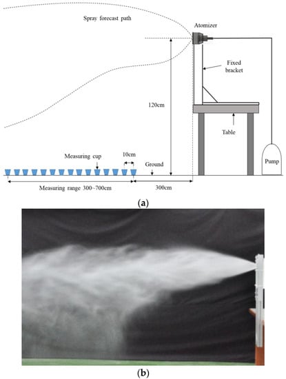 Experimental setup and typical spraying pattern. (a) Schematic diagram of the experimental setup. (b) Typical spraying pattern.