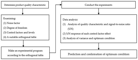 In this study, the above four parameters were taken as the control factors in the experimental design. The experimental procedure is illustrated in Figure 5, beginning with the determination of the quality characteristic, followed by determining the noise factors, degree of freedom, and factor levels so that an appropriate orthogonal table could be selected. Afterwards, experiments were carried out while data were acquired and analyzed to determine the optimum experimental condition and subsequent validation. Details are as follows.