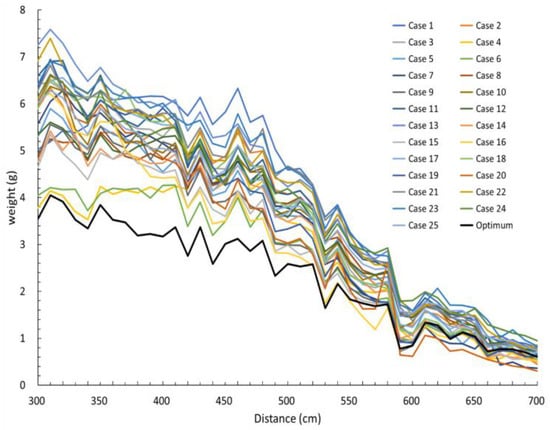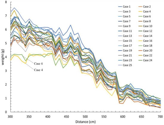 Quantitatively, the average droplet weight distributions along the nozzle centerline for the 25 experimental cases (three experiments per case for the average) are shown in Figure 7. The droplet weights along the centerline oscillate considerably due to the 10 cm pitch of the measurement cups. However, a clear trend, irrespective of the cases, shows that the droplet weights decrease as the distance from the nozzle exit increases as expected. Moreover, the curves in Figure 7 can be roughly categorized into two clusters; one consists of Cases 4 and 6; the other consists of the rest of the cases.