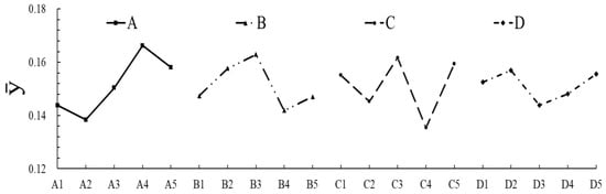 A similar trend can also be observed from the quality characteristic drawn in Figure 9. The quality characteristic is the average slope of the three repeated experiments of each of the twenty-five cases given in Table 2. The optimum condition is identical to that of the S/N response of the control factors, namely, A2, C4, B4, and D3 for their minimum values of achieving the smaller-the-better goal.