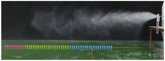 A schematic diagram of the experimental setup, consisting of a water pump, a supporting steel table with a fixed bracket, an atomizer, and a water droplet weight measuring cups, is depicted in Figure 4a. Water was adopted as the spraying liquid. It was driven by a water pump to provide a gauge pressure of 33 kgf/cm2 (approximately 485 psig). The resulting Reynolds number of the liquid jet was about 125,400, namely, a turbulent liquid jet. Water was sprayed continuously for 60 s under the constant gauge pressure of 33 kgf/cm2. The atomizer was 120 cm above the ground floor. The water droplet weight measuring range was from 300 cm to 700 cm from the atomizer. The pitch of the measuring cups was constant with the value of 10 cm. In addition to the droplet weight measurements, the spraying patterns were also recorded for further analysis. A typical example of the sprayed pattern, as depicted in Figure 4b, shows that the jet is not symmetric due to the influence of gravity.
