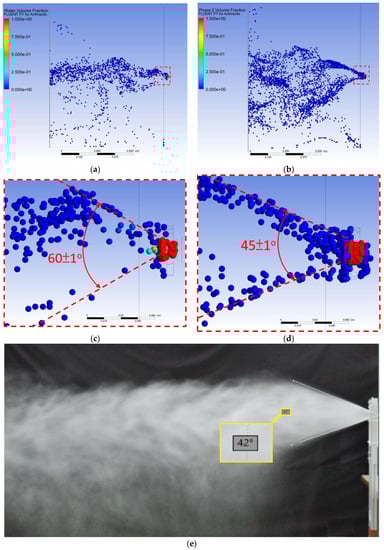 Comparison of spray patterns of CFD simulations and experiments of two atomizers. (a) Spray distribution of Case1 atomizer (simulation) (b) Spray distribution of optimum atomizer (simulation). (c) Spray opening angle 60 ± 1° of Case1 atomizer(simulation) (d) Spray opening angle 45 ± 1° of optimum atomizer (simulation). (e) Spray opening angle 42° of optimum atomizer (experiment).