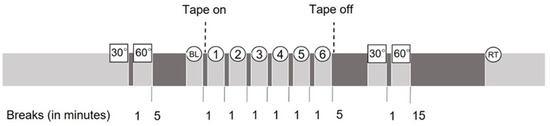 The study design comprised a repeated lifting task and a repositioning task. Both groups performed the same tasks and followed the same procedure. In total, the lifting task consisted of eight lifting blocks with ten repetitions each. The participants executed one lifting block without any feedback, which was considered as a baseline measurement. After that, six more lifting blocks were performed with tape applied to the participants’ lumbar extensor muscles. After each block, there was a short one-minute break, to mitigate any effects of neuromuscular fatigue. At the end of the experiment, the last lifting block was executed without any additional feedback, which was considered as a retention measurement. The repositioning task was performed at two different measurement times (before the baseline and after the sixth lifting block). The task was executed under two different target angle conditions (30 degrees and 60 degrees) (for a detailed overview of the procedure, see Figure 1).