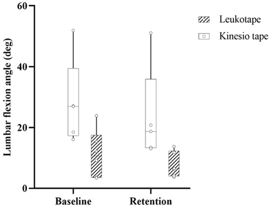 There was a significant group effect (F [1,18] = 12.53, p = 0.02), but there was no significant effect of the measurement time (baseline, retention) (F [1,18] = 2.86, p = 0.11) and no interaction effect between the measurement time and group (F [1,18] = 0.38, p = 0.55). Post hoc tests revealed that lumbar flexion was significantly higher (baseline and retention sessions combined) in the kinesio tape group compared to the leukotape group (p = 0.02). The estimation of the effect sizes revealed a small reduction from baseline to retention in the kinesio tape group (d = 0.31), and a moderate reduction in the leukotape group (d = 0.60) (Table 1, Figure 2).