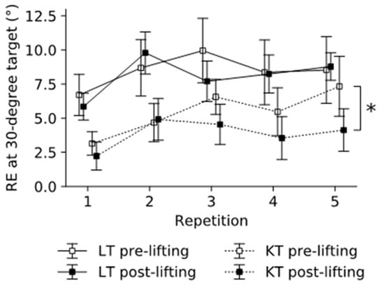 Repositioning error from 30-degree target position over measurement times and repetitions. The difference was significant between pre- and post-lifting at repetition five in the kinesio tape group (LT = leukotape group; KT = kinesio tape group). * indicates statistically significant differences.