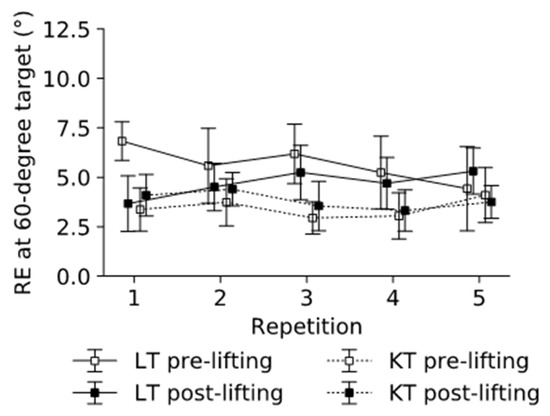 Within the groups, a significant interaction effect of the measurement time and repetition was found (F [10,100] = 4.32, p < 0.01). However, the post hoc tests revealed no significant differences between measurement times at different repetitions. The estimation of the effect sizes revealed a small reduction from pre-lifting to post-lifting in the leukotape group at the 60-degree target position (d = 0.30), while no such effect was found in the kinesio tape group (d = 0.17) (Table 2, Figure 4).
