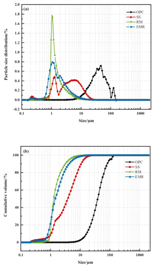 Figure 1 depicts the particle size distribution of the raw materials, where the particle size of OPC ranges from 5.3 to 164.8 μm, with an average size of 67.7 μm. The particle size of SS ranges from 0.2 to 29.5 μm, with an average size of 3.79 μm. The particle size of RM ranges from 0.5 to 9.4 μm, with an average size of 1.29 μm. The particle size of EMR ranges from 0.54 to 13.19 μm, with an average size of 1.46 μm. It can be judged that the D50 of the raw material particles are ranked from largest to smallest: OPC, SS, EMR, and RM, which is consistent with the experimental results of specific surface area.