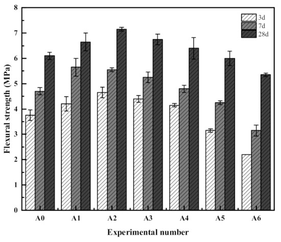 Figure 2 depicts the flexural strengths of the composite mortar at 3 d, 7 d, and 28 d. The figure shows that compared with group A0, the flexural strength of composite mortar of groups A1–A6 at each age demonstrated a trend of first increasing and then decreasing. The flexural strengths at 3 d increased by 10.5%, 23.7%, 15.8%, 10.5%, −15.8%, and −42.1%, respectively. The flexural strengths at 28 d increased by 9.8%, 18.0%, 11.5%, 4.9%, −1.6%, and −11.48%, respectively. The highest flexural strengths were 4.7 MPa and 7.2 MPa for the composite mortar of group A2 at 3 d and 28 d, respectively.