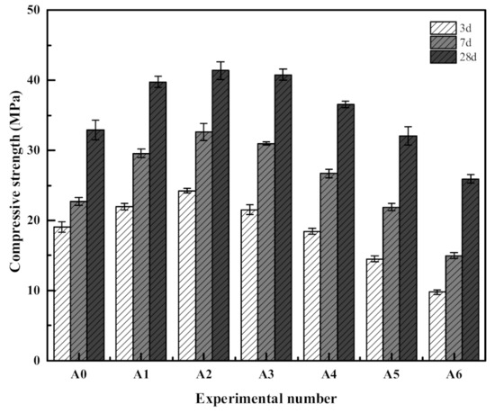 Figure 3 shows the compressive strengths of the composite mortars at 3 d, 7 d, and 28 d. The compressive strength activity indices of the composite mortar for each group of A0–A6 at 3 d were 78.9%, 90.9%, 100.4%, 88.8%, 76.0%, 59.9%, and 40.5%, respectively. At 28 d, the compressive strength activity indices of the composite mortar for each group of A0–A6 were 59.9%, 72.1%, 75.1%, 74.0%, 66.4%, 58.3%, and 47.2%, respectively. Compared with group A0, the compressive strengths of composite mortars of groups A1–A6 exhibited a trend of first increasing and then decreasing at all time periods. The compressive strengths at 3 d increased by 15.2%, 27.2%, 12.6%, −3.7%, −24.1%, and −48.7%, respectively. The compressive strengths at 28 d increased by 20.3%, 25.5%, 23.6%, 10.9%, −2.7%, and −21.2%, wherein the highest compressive strengths were 24.3 MPa and 41.4 MPa for the composite mortar of group A2 at 3 d and 28 d, respectively.