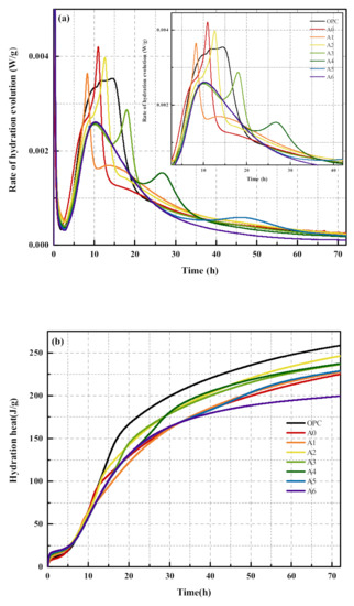 The heat of hydration is an essential parameter for evaluating the hydration process of gelling materials, which can well reflect the dynamic process of slurry hydration [16]. Usually, the hydration reaction process of gelling materials is divided into five stages [17,18]: dissolution period, induction period, acceleration period, deceleration period, and stabilization period. Figure 4 shows the exothermic rates of hydration and accumulated exothermic heat of the composite net slurry for 72 h. The characteristic values of the hydration exothermic behavior are shown in Table 4. The exothermic rate diagram in Figure 4a shows that the first exothermic rate peak is formed rapidly after contact with water, which is caused by the exothermic dissolution of aluminates and sulfates in the cementitious material in contact with water [19]. Subsequently, the hydration reaction of the slurry enters the induction period, and small amounts of hydration products AFt and Ca(OH)2 are generated. Compared with the induction period of the OPC group, the induction period of the A0 group was prolonged, while the induction period of the A1–A6 group was shortened after the redoping of appropriate amounts of RM and EMR. In addition, during the acceleration phase, the peak of 3.32 × 10−3 mW/g was reached at 10.0 h for the OPC group and 4.20 × 10−3 mW/g at 10.9 h for the A0 group. In contrast, the induction period of the A1–A6 group was shortened after compounding with appropriate amounts of RM and EMR. With the increase of EMR doping, the appearance of the second exothermic rate peak was gradually delayed, and the peak height showed a trend of first increasing and then decreasing. Meanwhile, the third exothermic rate peak was gradually separated. The formation of the third exothermic rate peak was related to the recrystallization of AFt following sulfate depletion [20,21]. With the increase in EMR doping, the appearance of the third exothermic rate peak was gradually delayed and the peak height was steadily reduced. The cumulative exotherm plot in Figure 4b shows that the cumulative hydration exotherm of the composite system decreased to different degrees compared with the OPC system because of the dilution effect of SS, RM, and EMR doping. The hydration exotherm of the A0 group was significantly lower, with a cumulative hydration exotherm of 225.0 J/g at 72 h, which was 87.0% of that of the OPC group (258.5 J/g). After the blending of RM and EMR, with the increase of EMR, the cumulative heat release of hydration showed a trend of increasing first and then decreasing. It can be inferred that the incorporation of SS will inhibit the hydration reaction of the slurry, slow down the rate of hydration exotherm, and reduce the cumulative heat release of the slurry, while the compounding of RM and EMR in appropriate proportion can promote the hydration reaction of the slurry, accelerate the rate of hydration exotherm, and increase the cumulative heat release.