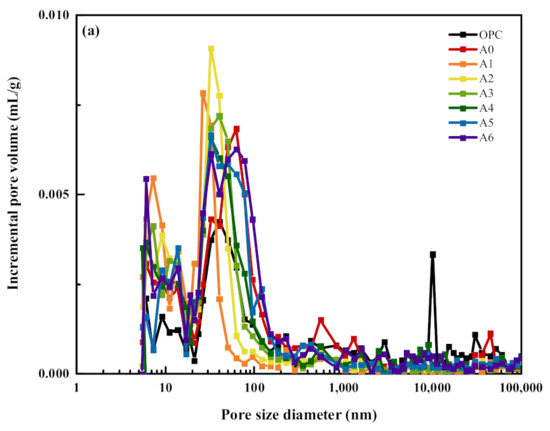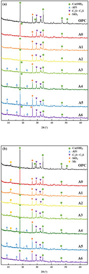 Figure 6 shows the TG–DTG curves of composite net pulp at 28 d of age, and the mass loss rates are shown in Table 5. From the TG diagram, it can be learned that the total mass loss rate of each group of composite net pulp is in the order of A6 group > A4 group > A5 group > A3 group > A2 group > A1 group > A0 group from the largest to the smallest. Corresponding to the DTG diagram, it can be seen that four main decomposition peaks exist in each group of composite net pastes: the decomposition peaks existing before 60~300 °C correspond to the initial dehydration of C–S–H gels and the early thermal decomposition of AFt; the mass loss existing between 400~600 °C is mainly attributed to the thermal decomposition of Ca(OH)2; the mass loss existing between 600~750 °C is mainly caused by the thermal decomposition of calcite (CaCO3) produced by carbonization of the specimens during the hardening process [5,23]. From this, it can be judged that the content of hydration products Ca(OH)2, Aft, and C–S–H gel is significantly reduced in the specimens of group A0 compared to group OPC. Compared to the A0 group, the content of AFt and C–S–H gels gradually increased and the content of Ca(OH)2 gradually decreased in the A1–A6 group, which indicates that the compounding of suitable proportions of RM and EMR can promote the hydration reaction of the slurry, consume Ca(OH)2, and generate AFt and C–S–H gels that are more favorable to the development of mechanical properties, which is consistent with the XRD test results.