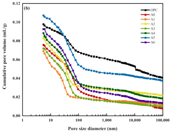 Composite mortar distribution of the pore structure: (a) pore size distribution; (b) cumulative distribution.