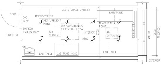 The measurements were performed in a biotechnological laboratory for DNA analysis equipped with air filtration (HEPA—filter class E12: filters are designed to trap particles of 0.3–1 μm at an efficiency of EN 779 > 99.5%) and air conditioning systems. The ventilation of the biotechnology laboratory was carried out using positive pressure. The office was ventilated naturally (through windows). The laboratory was separated from the corridor by a door with a self-closing device. However, the door did not have a sufficient sealing function and did not separate the laboratory from the surroundings. The connecting corridor near the laboratory led to the area where the offices were located. This area was also separated by a door with a self-closing device. The floor area of the laboratory was 15.66 m2, the clear height of the room was 2.75 m and the volume of the room was 43.06 m3.