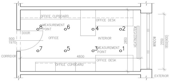 Schematic drawing of the office (dimensions in mm; measurement points no. 1 to 8).